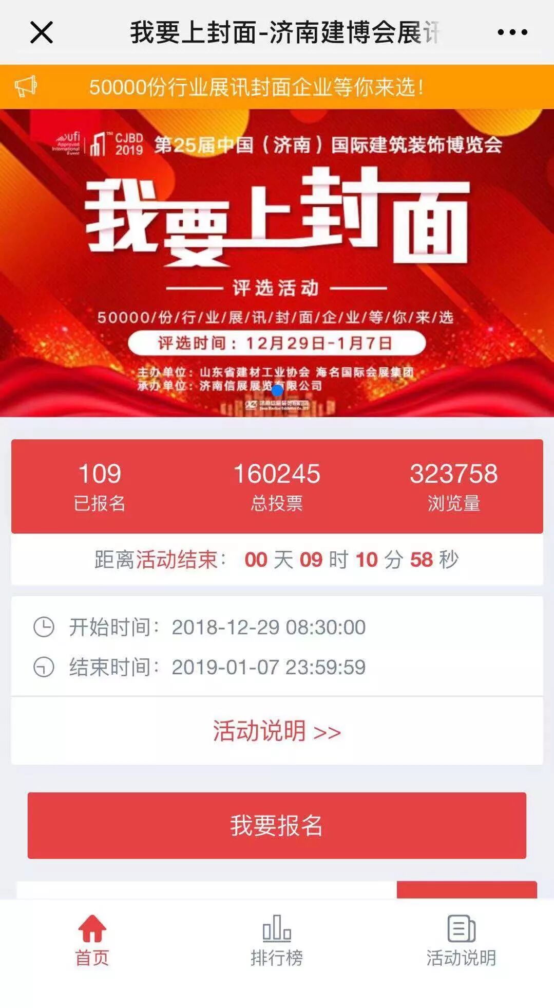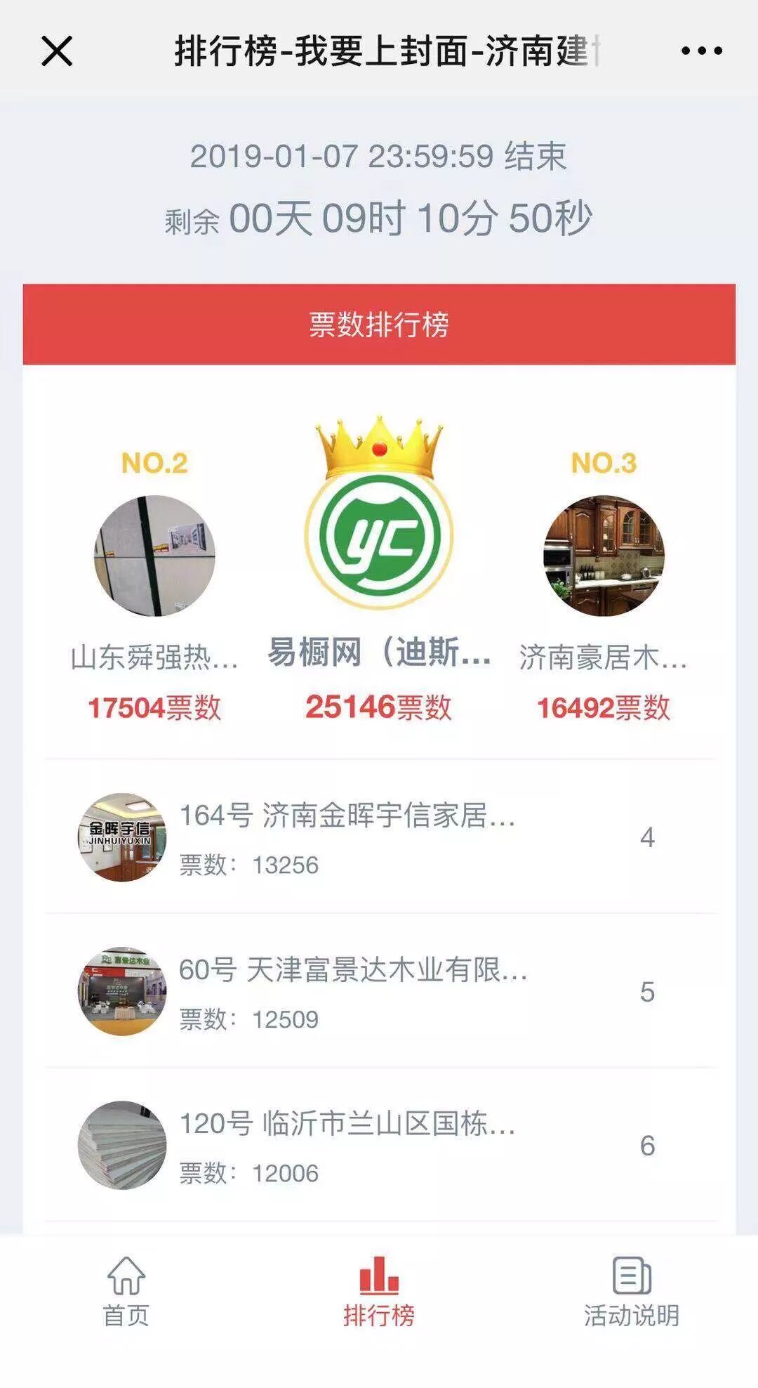 经历了9天漫(短)长(暂)的等待 2019济南建博会“我要上封面” 优秀展商评选大赛 马!上!要!结!束!啦! 活动以排山倒海之势吸引了近16万人次的疯狂投票,虽然小编表示虽然有所准备,但还是被惊到了。 先来看下本次评选活动 大家创造的记录吧! 自12月29日启动以来 共计109位优秀企业参与 累计达到160245次投票 累计活动访问量竟高达32万余次! 火 火 火 火 火火 火 实在太火爆啦! 在109名优秀的参与选手中,有易橱网、山东舜强热能科技有限公司、济南豪居木业有限公司等杰出企业,可见遴选出来的企业果然都是精英中的精英。仅仅6天,第一名易橱网,就获得了共28535浏览量及25141的总票数!狂受参与者的热烈追捧,票数还在持续上升中… 「我要上封面」评选活动将于 1月7日晚23:59分正式结束 在此感谢各位网友们的踊跃参与! 最终获奖企业将会荣登济南建博会展讯封面 成为济南建博会2019年度最引人注目的企业 敬请期待!