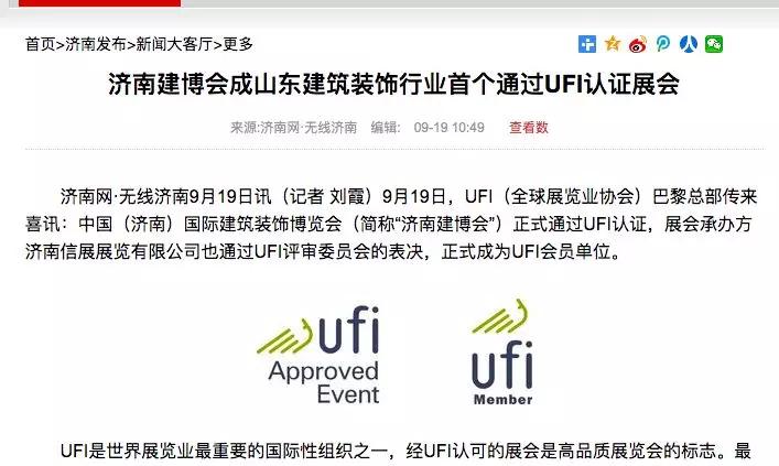 2017年9月,济南建博会正式通过UFI认证,展会承办方济南信展展览有限公司也通过UFI评审委员会的表决,正式成为UFI会员单位,实现济南会展UFI认证零突破。