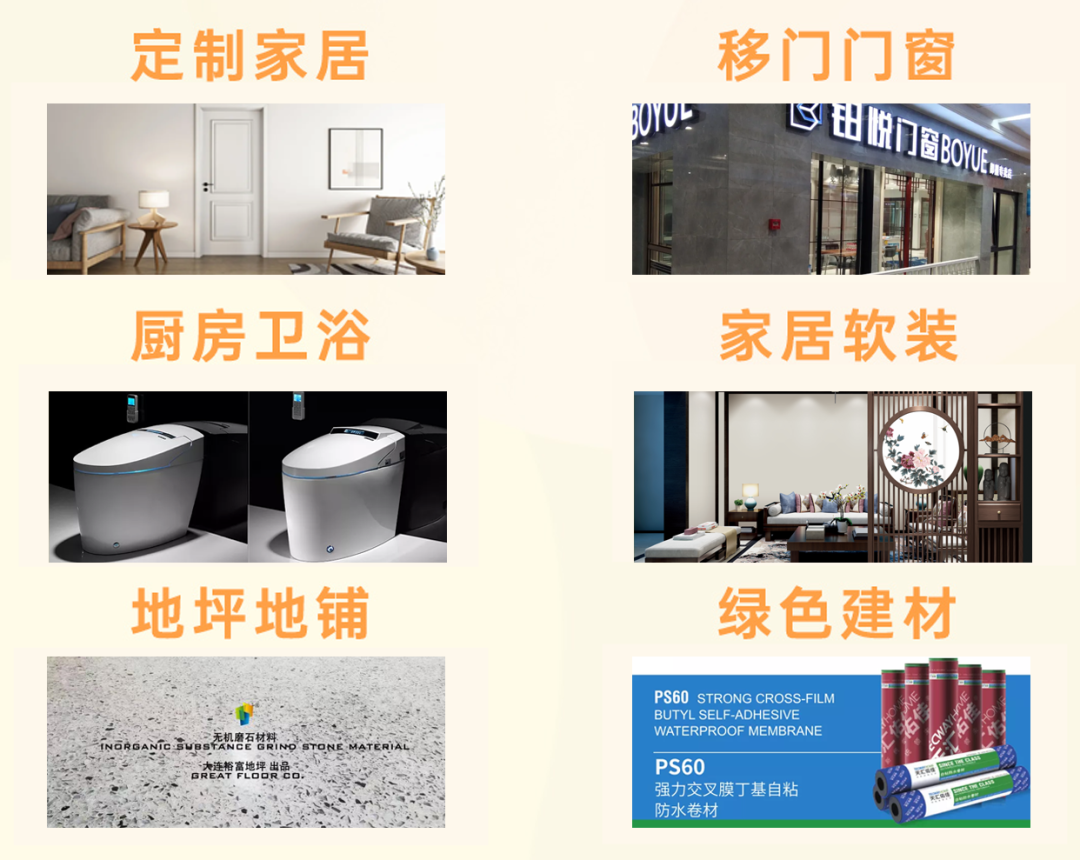 展示范围涵盖定制家居、移门门窗、智能厨卫、绿色建材、地坪地铺、家居软装等多个版块,覆盖建材行业全产业链,满足买家各类需求,上下游一站式对接。最大化节省资源、提升效率!